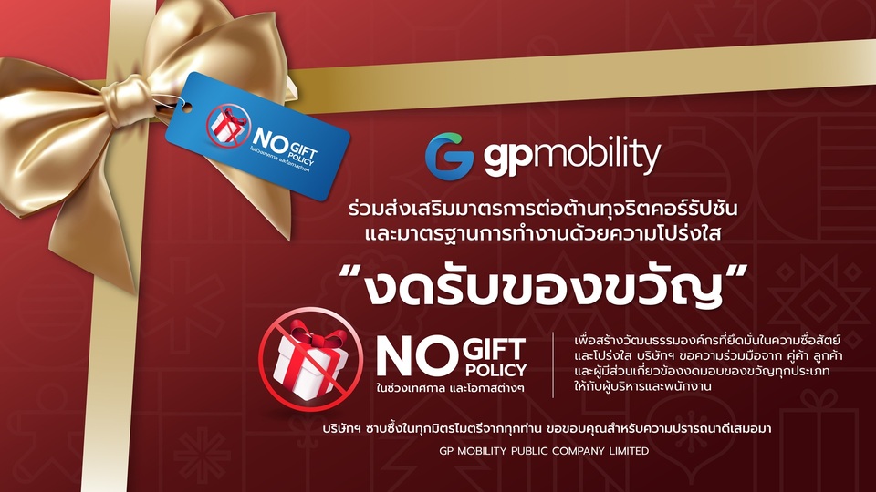 บริษัท จีพี โมบิลิตี้ จำกัด (มหาชน) หรือ GP Mobility Public Company Limited ร่วมส่งเสริมมาตรการต่อต้านทุจริคคอร์รัปชัน และมาตรฐานการทำงานด้วยความโปร่งใส “No Gift Policy” งดรับของขวัญในทุกเทศกาล และโอกาสต่างๆ เพื่อสร้างวัฒนธรรมองค์กรที่ยึดมั่นในความซื่อสัตย์ และโปร่งใส บริษัทฯ ขอความร่วมมือจาก คู่ค้า ลูกค้า และผู้มีส่วนเกี่ยวข้องงดมอบของขวัญทุกประเภท ให้กับผู้บริหารและพนักงาน บริษัทฯ ซาบซึ้งในทุกมิตรไมตรีจากทุกท่าน ขอขอบคุณสำหรับความปรารถนาดีเสมอมา